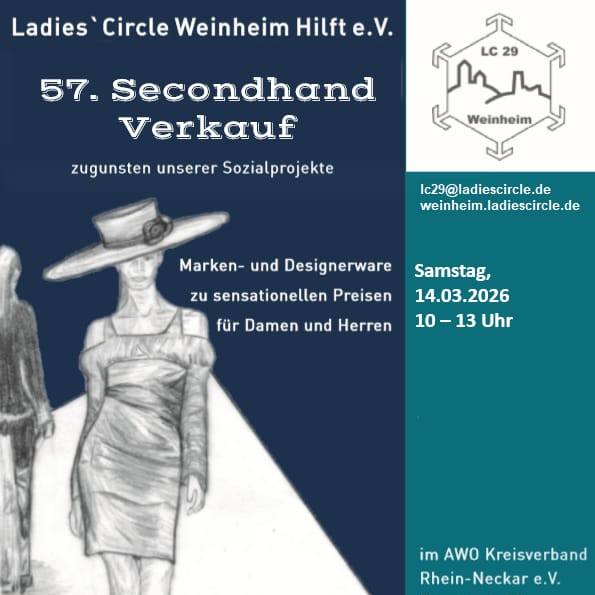 Der Ladies Circle Weinheim lädt wieder zum großen Second-Hand-Kleidermarkt ein – am 14. März könnt ihr nicht nur nachhaltig shoppen und tolle Schnäppchen machen, sondern euch auch wieder auf einen leckeren Kuchenverkauf freuen, der liebevoll vom Agora Club Tangent (ACT) Weinheim ausgerichtet wird. Perfekt für eine kleine Stärkung zwischendurch oder zum Mitnehmen für Zuhause.